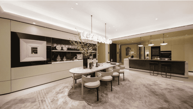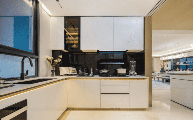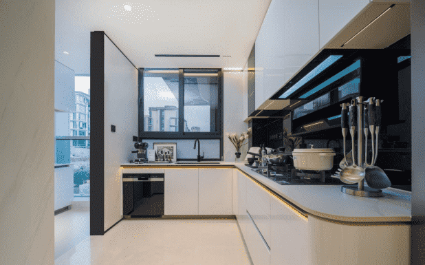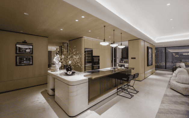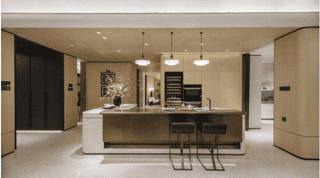 兩廚一島中西廚兼?zhèn)涞娜诵曰O(shè)計(jì),從封閉廚房到開放空間,廚房變成看得見的社交場和家庭互動(dòng)的中心。料理臺(tái)和餐廳連接在一起,營造出親切的互動(dòng)交流氛圍。