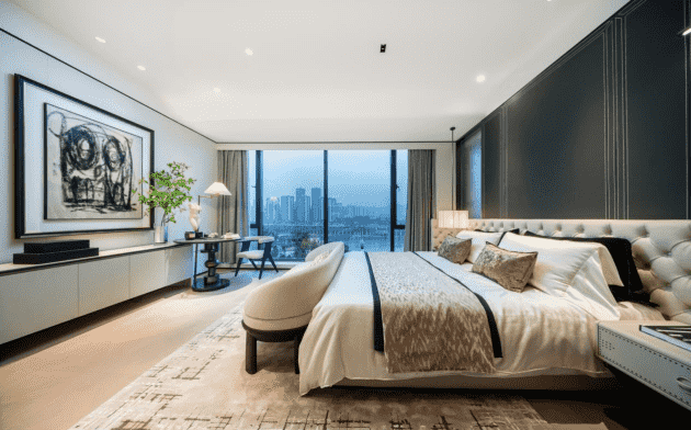 滿滿儀式感的主臥室,奢雅有度的理想居所,大氣優(yōu)雅的同時(shí)不失松弛舒適。墻面層次豐富,木護(hù)墻溫暖圍裹睡眠區(qū),骨骼線勾勒出質(zhì)感。飽滿的真皮床給人足夠的安全感,不斷叩問著主人的內(nèi)心世界,挖掘主臥與人之間緊密的情感聯(lián)結(jié)。